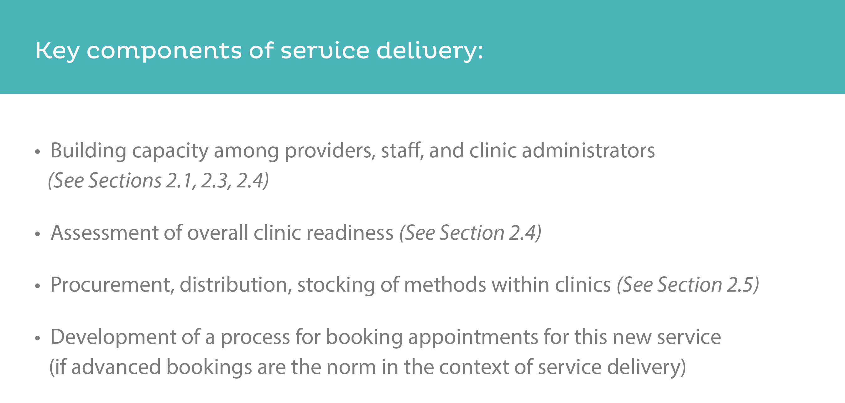 For a program whose goal is to increase access to high-quality contraceptive services, program implementation should focus on activities specific to contraceptive service delivery. This Section addresses basic components of program implementation.